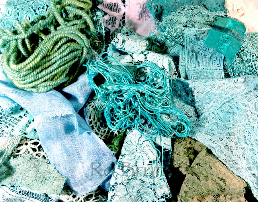 I'll be cutting some of these fabrics, laces and doilies up and making colour packs like the ones below to add to my